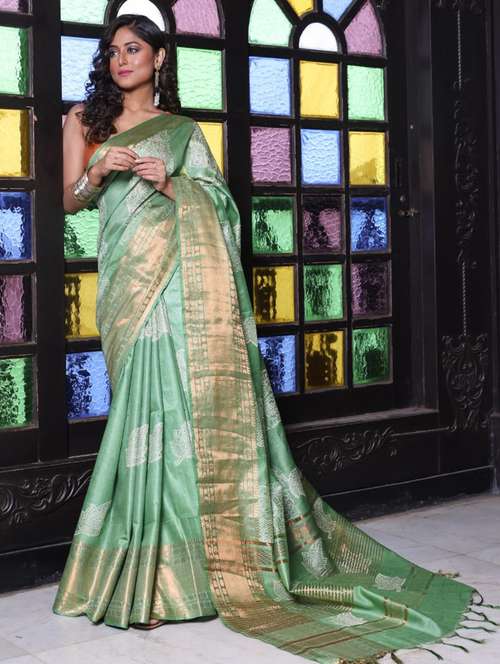 Designed from the finest quality sap green silk blend fabric, this alluring sari with statement hues and contrast print is a must-have. Style this sari with statement jewelry and block heels for an effortlessly classy look on any traditional occasion.