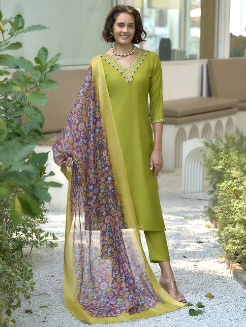 • Find gorgeous sets of ethnic wears in trending designs in green colors suitable for festive wear of occasions.