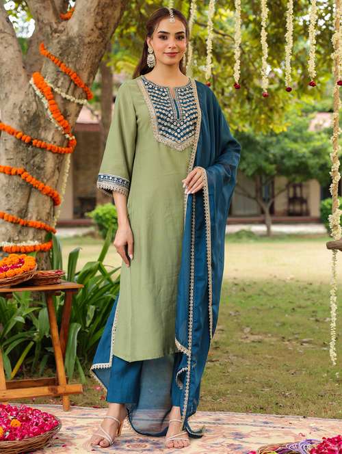 - Find gorgeous sets of ethnic wears in trending designs in green colors suitable for festive wear of occasions.