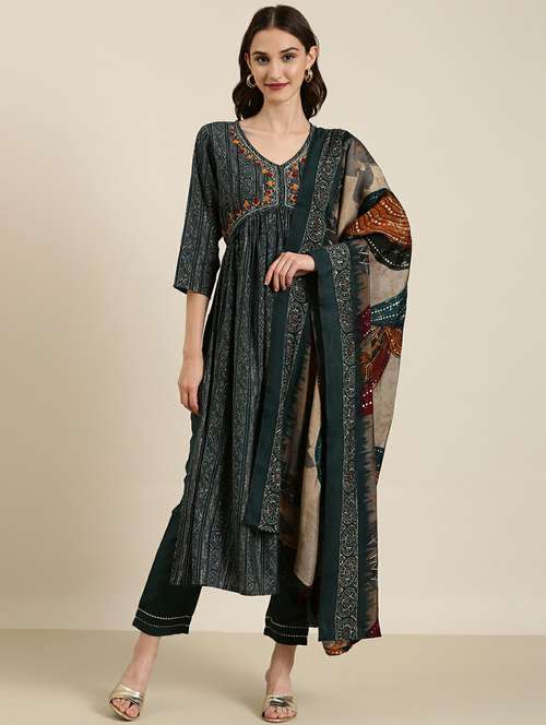 - Find gorgeous sets of ethnic wears in trending designs in teal colors suitable for festive wear of occasions.