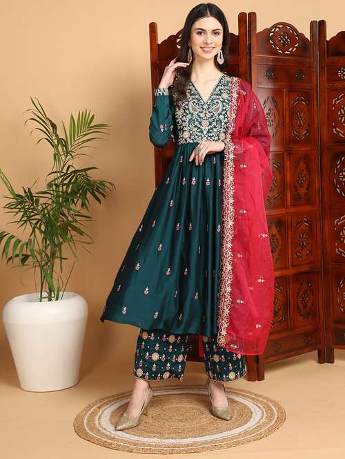 - » women teal v neck kurta pant set with dupatta