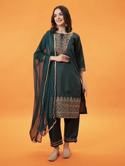 - Find gorgeous sets of ethnic wears in trending designs in teal colors suitable for festive wear of occasions.