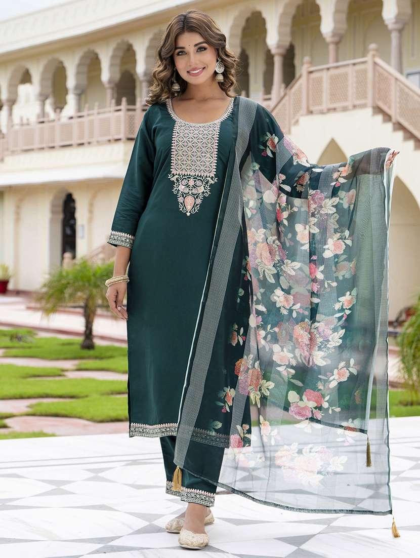 - Find gorgeous sets of ethnic wears in trending designs in bottle green colors suitable for festive wear of occasions.
