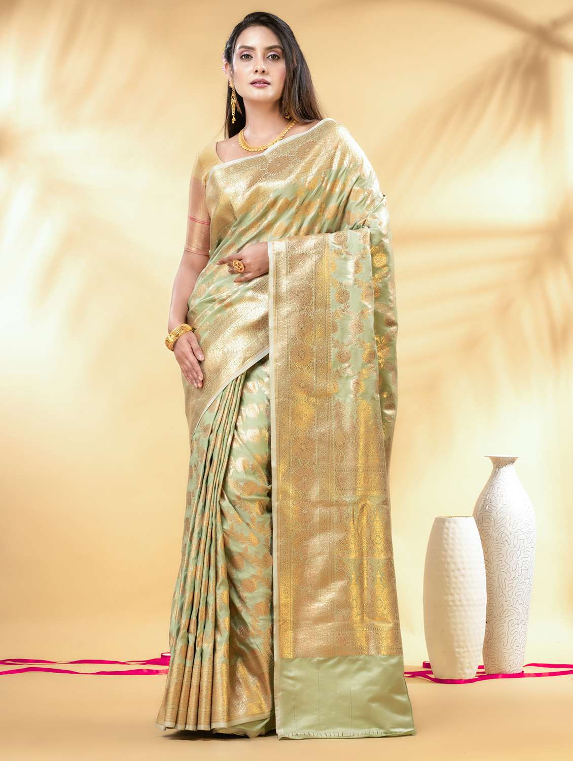 Step into the world of elegance and tradition with this Beautiful Pistachio Green Katan Banarasi Silk Saree, a timeless piece crafted for the modern yet traditional woman. Made from luxurious pure Katan silk, this saree features a soft and graceful peach color base adorned with exquisite golden zari floral and leaf motifs throughout the body. The broad golden zari border and richly woven pallu add an extra layer of grandeur and sophistication. Lightweight yet opulent, this saree drapes beautifully and is ideal for weddings, receptions, festive gatherings, and special occasions. It comes with a matching unstitched blouse piece with zari detailing for a complete traditional look.