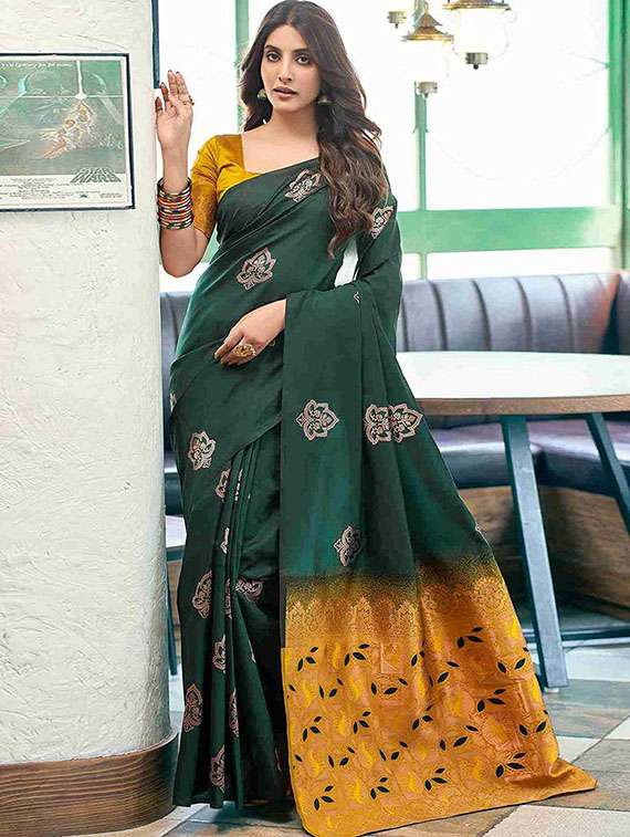 This Green Banarasi silk saree features a beautiful zari buta pattern, creating a luxurious and festive look. Crafted from premium Banarasi silk, it offers a rich texture and a graceful drape. The saree comes with a matching unstitched Banarasi silk blouse piece, allowing you to customize it according to your preferred design and style. Perfect for festive occasions and functions, this saree ensures a refined and captivating appearance.