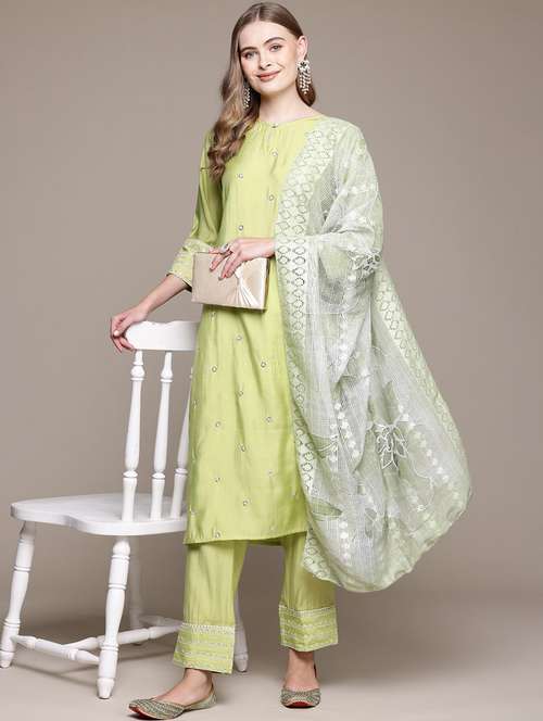 - Find gorgeous sets of ethnic wears in trending designs in green colors suitable for festive wear of occasions.
