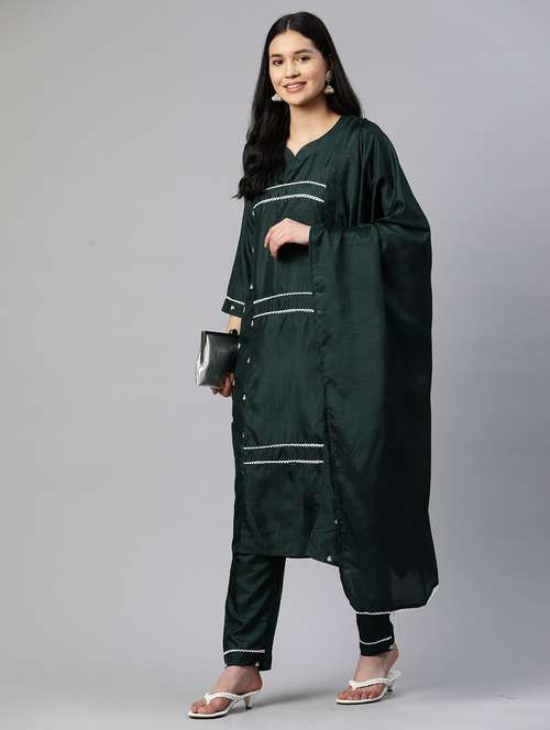 - Find gorgeous sets of ethnic wears in trending designs in bottle green colors suitable for casual wear of occasions.