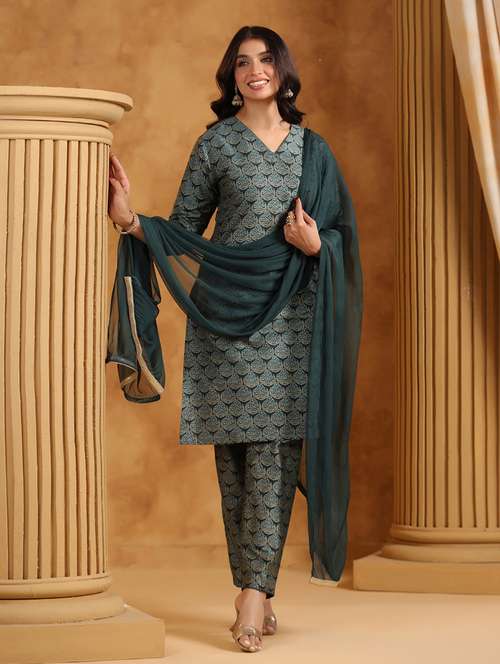 - Browse through the latest range of ethnic sets for women with tailored sleeve designs with traditional works.