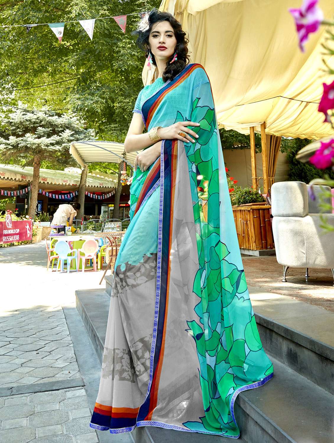 contrast bordered printed saree with blouse