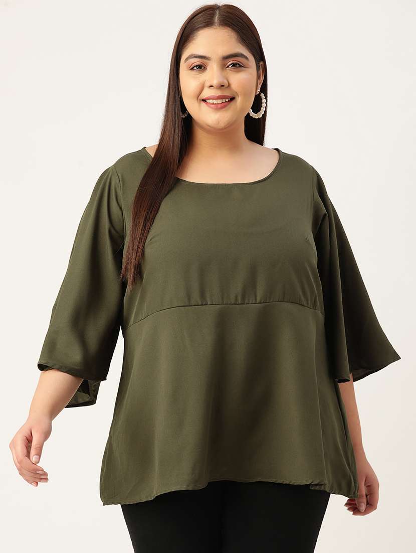 theRebelinme Plus Size Women's Olive Solid Color Longline Top, has a round neck, 3/4th sleeves and curved hem.