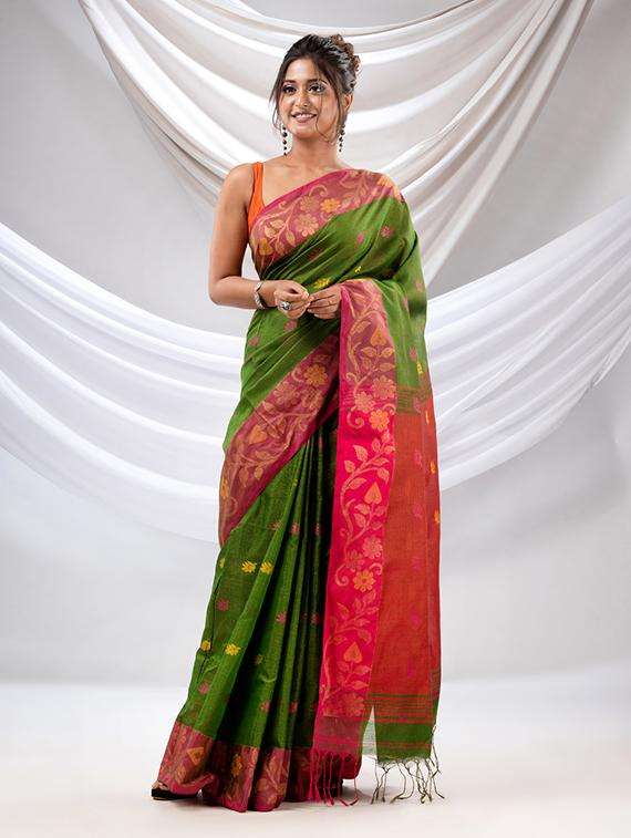 Green Tissue Handwoven Soft Saree With Floral Nakshi Borders