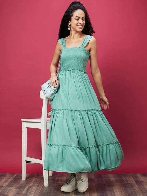 Infuse freshness into your wardrobe with our Green Smocked Tiered Maxi Dress. The fit and flare silhouette, shoulder straps, and smocked details create a fashionable look. The tiered design adds a playful element, making it ideal for a stylish and comfortable appearance.