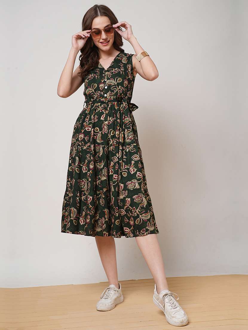 - » women bottle green printed tiered ethnic dress