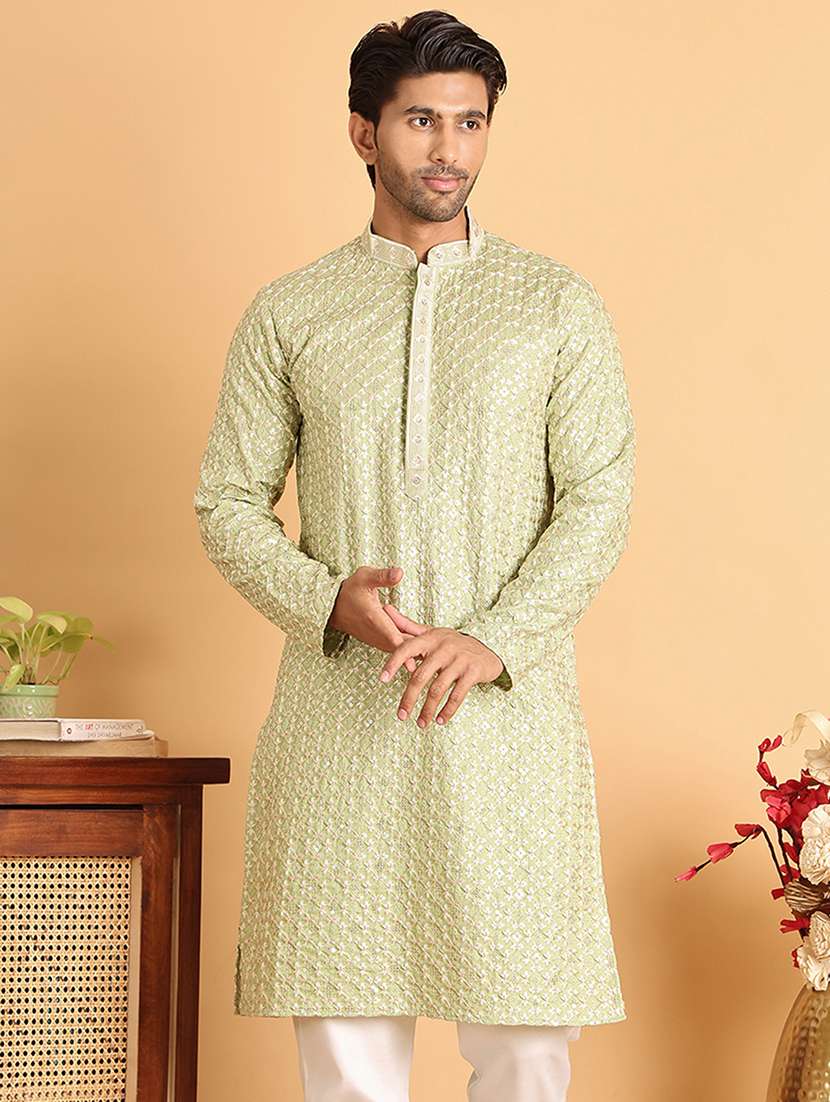 Green Embroidered and Sequins kurtas, Green straight knee length kurta, has a mandarin collar, long sleeves, straight hem.