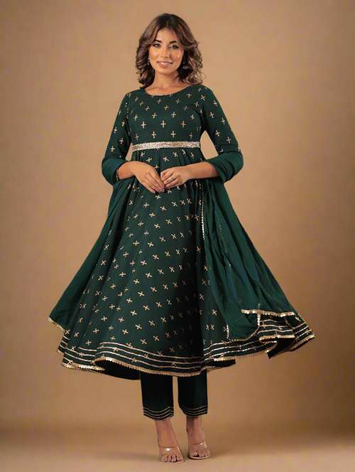 - Find gorgeous sets of ethnic wears in trending designs in bottle green colors suitable for festive wear of occasions.