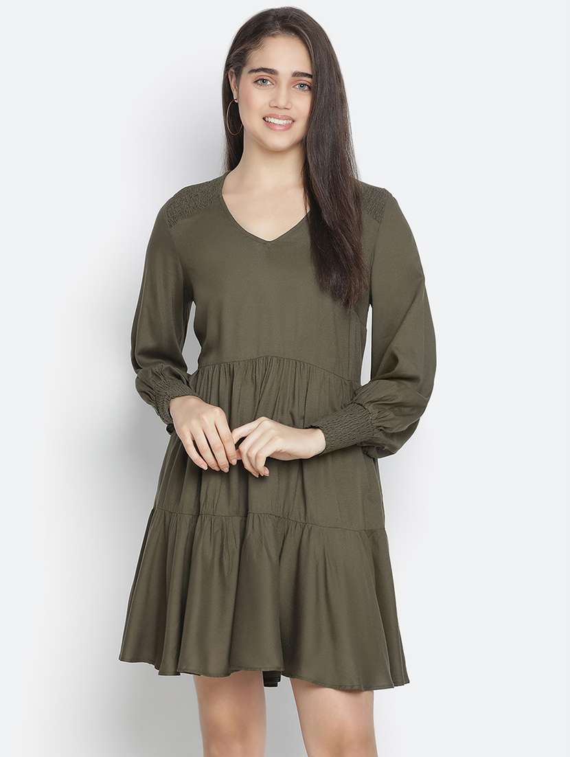 Don’t be ordinary make fashion every day with this Mombo khaki colour starling women dress. It is styled with a solid khaki colour, v- neckline with smocking on shoulders, and long sleeves. Gathered pleats and a flared hem to zenith the look. This season is for the dress season add this to your closet now.