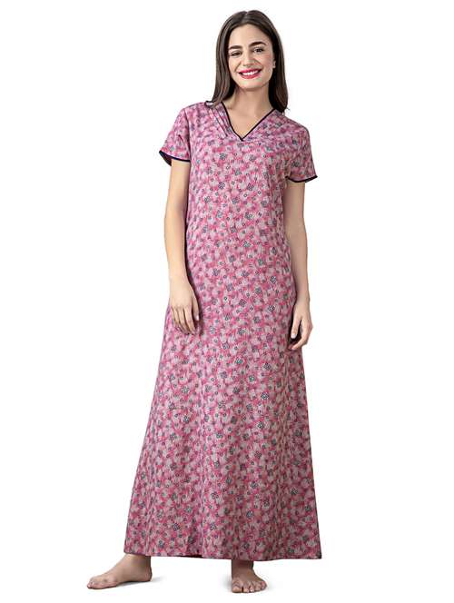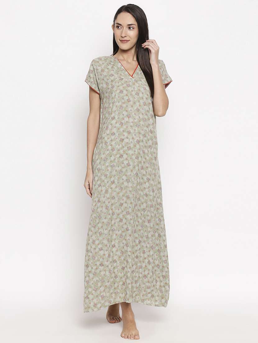 Trendy,Printed,V-Neck Long Nighty With Half Sleeves,Lace,Pleats And One Sided Pocket. Crafted In Alpine. Relaxed And Comfort Fit.