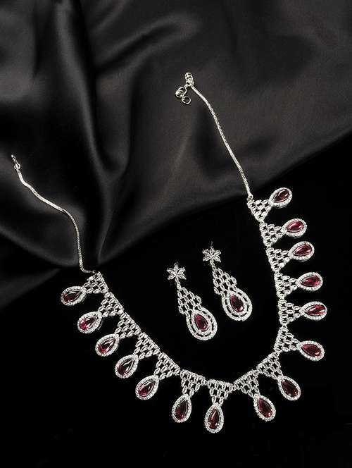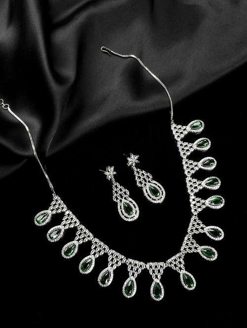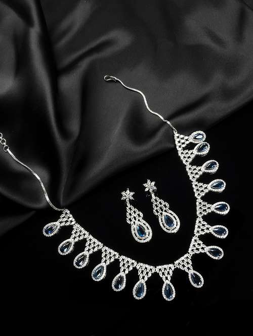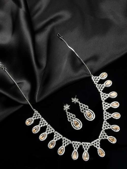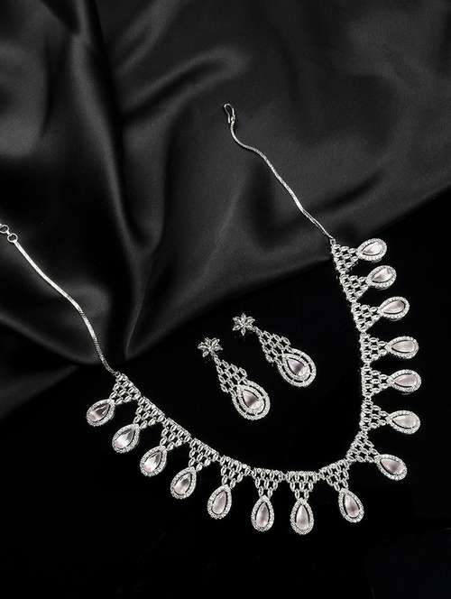 Elegant silver-plated necklace set with Matching Earrings sparkling American Diamond (AD) and Cubic Zirconia (CZ) stones. Perfect for weddings, parties, and gifting.