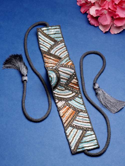 Smoke Grey & Multi Handmade Belt from Anekaant's Boho collection. Crafted with durable Canvas fabric, this belt features a Sequin Embellished pattern decorated with Tassels. It can be fitted securely around any waist size by just tying a knot. Pair this belt with any ethnic or western attire of your choice.