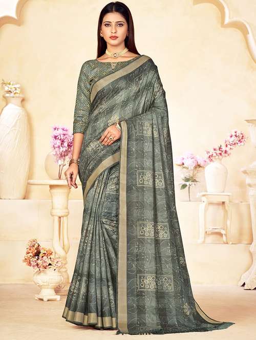 Elevate your ethnic wardrobe with this exquisite Dola Silk fancy Grey saree, a perfect blend of traditional craftsmanship and contemporary design. This elegant saree is crafted from high-quality Dola Silk, offering a luxurious feel and a graceful drape that is perfect for any special occasion.The sophisticated Grey hue of the saree adds a timeless charm, making it a versatile piece for various events. The saree features an intricate Khaddi Foil print, enhancing its elegance and providing a unique, eye-catching appearance. Adding to its opulence, the saree is adorned with a Gold weaved Swaroski Border, which exudes grandeur and makes a statement at weddings, parties, and festive gatherings. The tassels on the pallu introduce a touch of modernity and flair to the traditional design. This saree comes with a matching Printed blouse piece, allowing you to create a cohesive and polished look effortlessly. The high-quality silk fabric ensures comfort and durability, making it suitable for long hours of wear during celebrations. Whether you're attending a wedding, a festive celebration, or a cultural event, this Dola Silk saree is a versatile and stylish choice. It also makes for an excellent gift for loved ones on special occasions such as birthdays, anniversaries, and festivals. Make a stunning impression at your next event with this Dola Silk fancy Grey saree, a beautiful fusion of tradition and contemporary style.