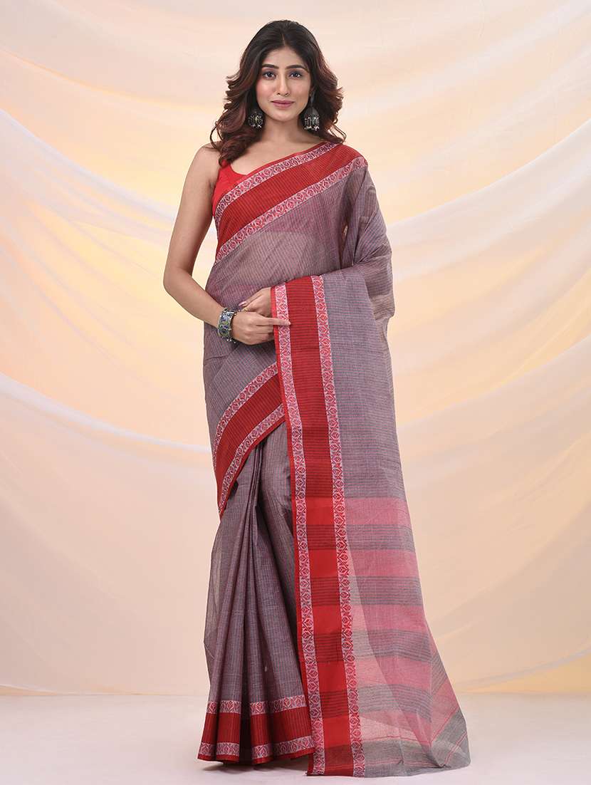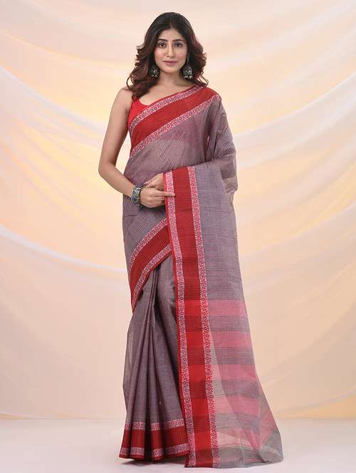Get a poised and dainty look in this grey pure cotton tant saree. It has woven designs and patterns all over for a beautiful look.