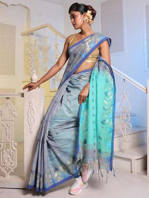 Urban and classy is what you will look in this grey blended cotton handwoven saree. It has small texture motifs woven all over. The borders have woven floral designs in silver and antique gold zari. Stripes are woven in the sea green pallu for a highlighted look.