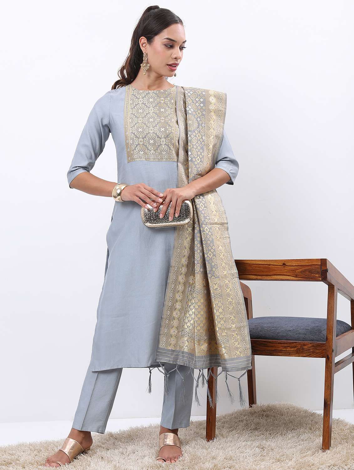 - Find gorgeous sets of ethnic wears in trending designs in grey colors suitable for festive wear of occasions.