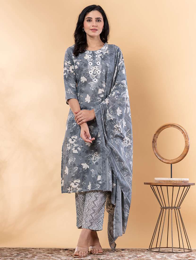 - Find gorgeous sets of ethnic wears in trending designs in grey colors suitable for casual wear of occasions.
