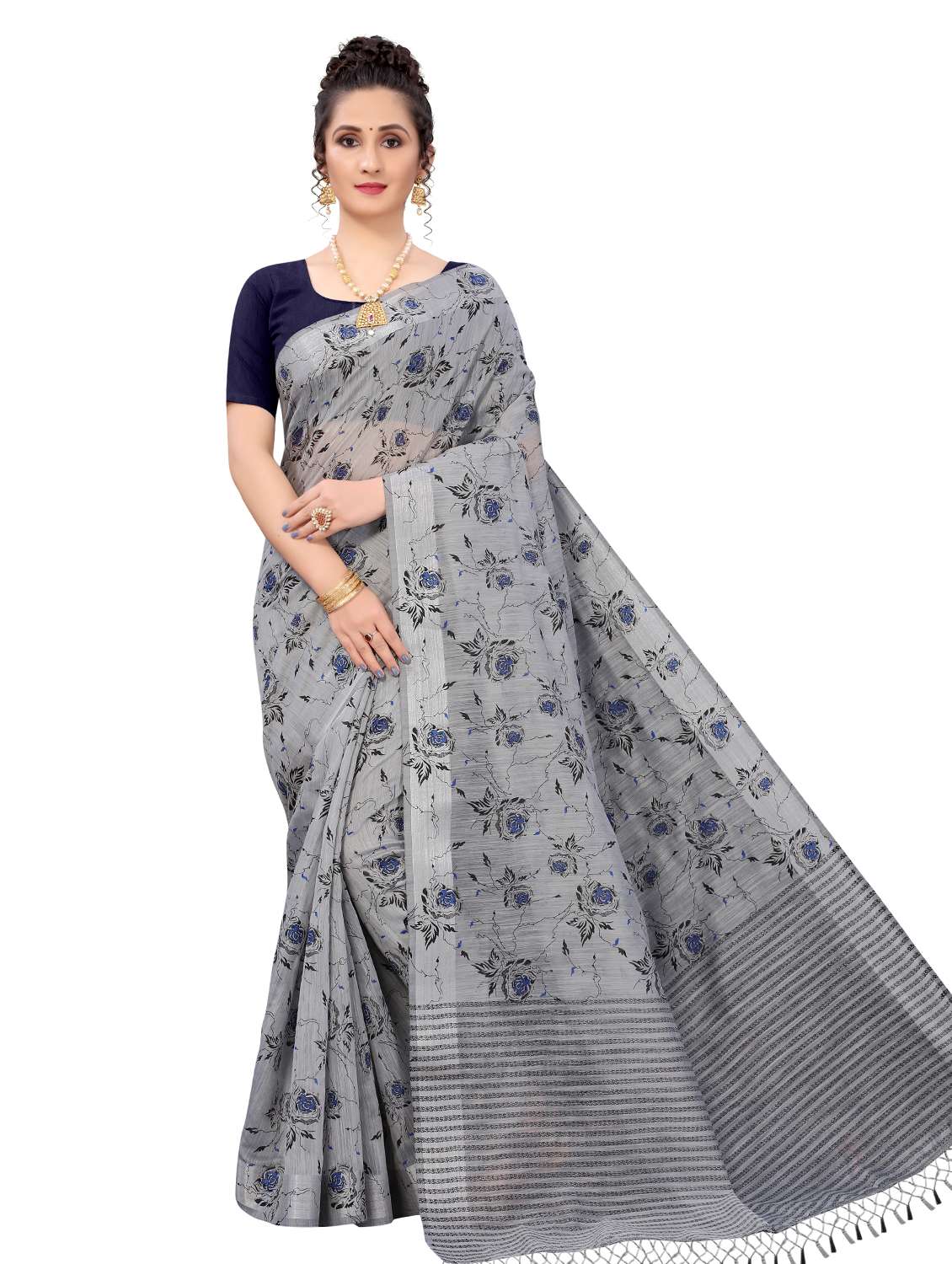 fabric : Cotton Blend with jari border, work : Floral block printed sari , attached bangalore silk blouse