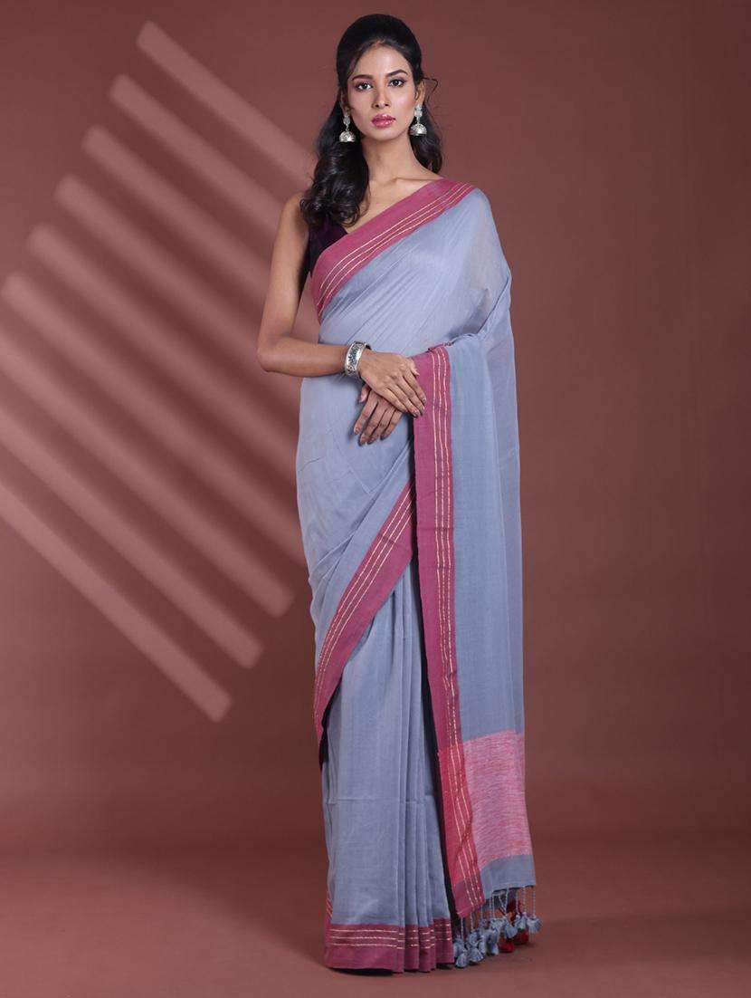 Look royal and loving in this grey pure cotton soft saree. It has stripe patterns allover the saree and contrast borders for a beautiful look.