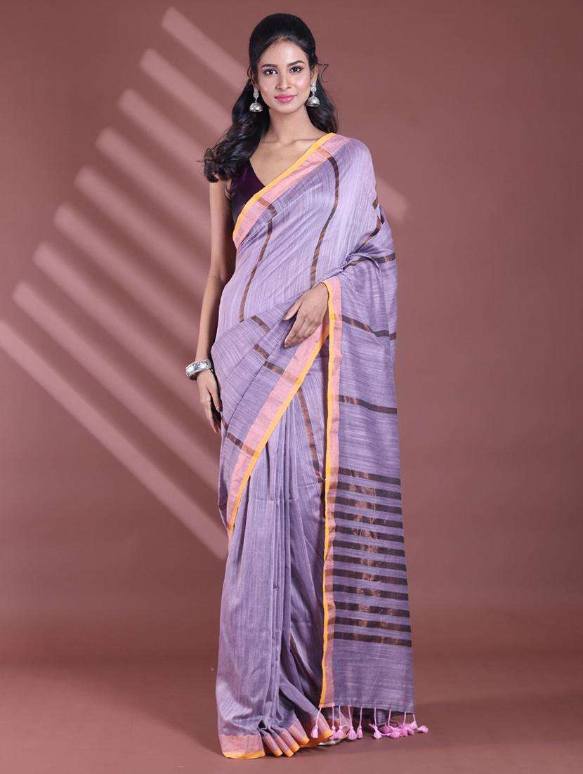 Look classy and posh in this grey pure cotton soft saree. It has\ zari stripe pattern all over the saree along with pallu and zari borders. The pallu is highlighted with pompom to complete the look.