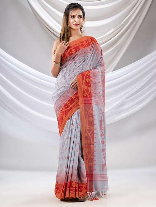 Bluish Grey Cotton Handwoven Saree With Jamdani Design
