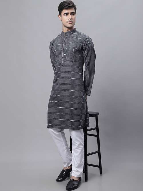 Enchanted Drapes Grey Printed Cotton Men's Long Kurta