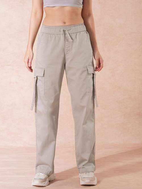 - » globus women cement grey cotton mid-rise elasticated waist wide leg cargo trousers