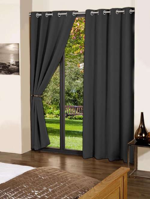 lushomes pirate black plain cotton curtains with 8 eyelets & plain tiebacks for long door