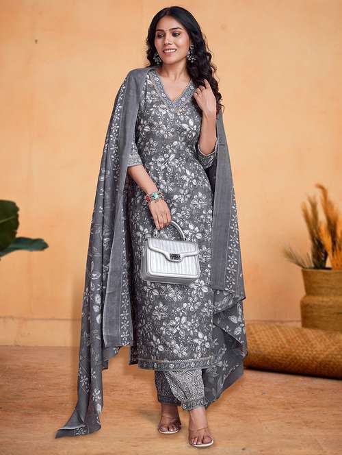 - Find gorgeous sets of ethnic wears in trending designs in grey colors suitable for casual wear of occasions.