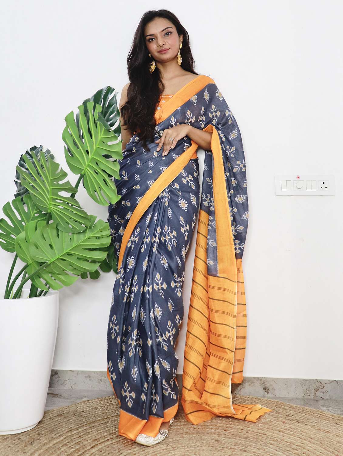 - » women ikat printed pure cotton saree with blouse