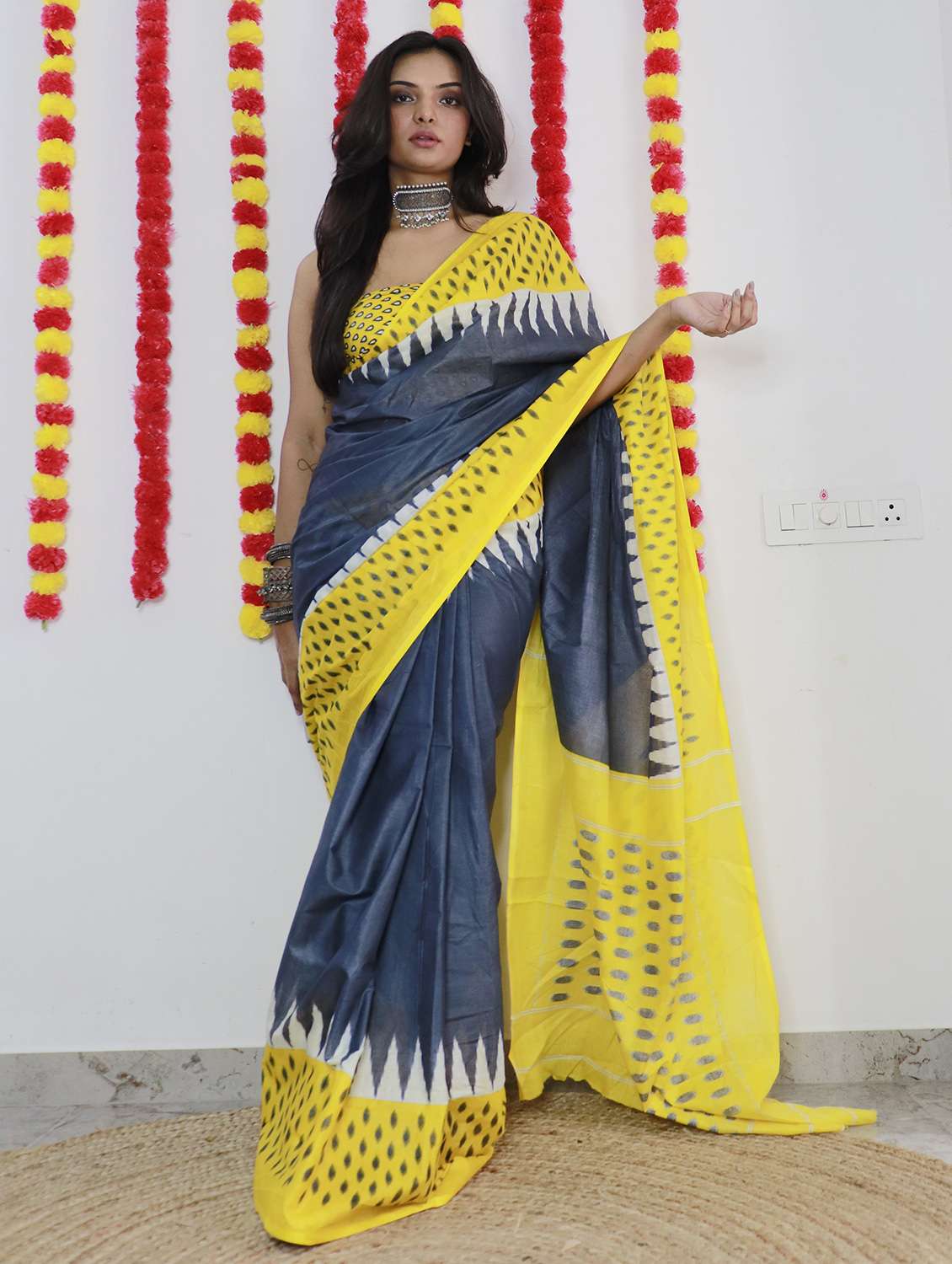 Pure Organic Cotton Mulmul Saree Crafted With Jaipuri Block Print With Natural Dye All Over. Saree Comes With Unstitched Mulmul Cotton Printed Blouse Piece. Note: Slight Misprint On Saree Is Possible Due To Hand Block Print By Artisans Which Should Not Consider As Stain, Misprint Or Any Other Qc Issue