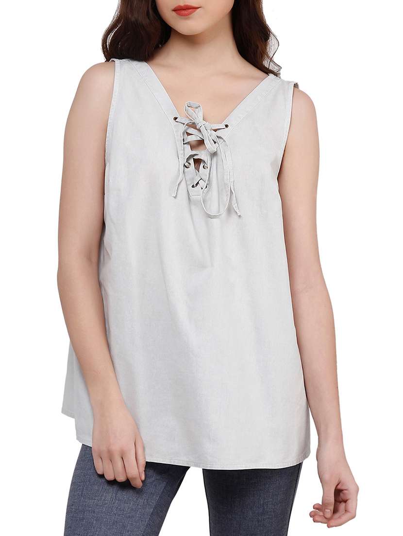 Get your favourite essential women casual cotton top in grey with eyelet tie-up neckline.