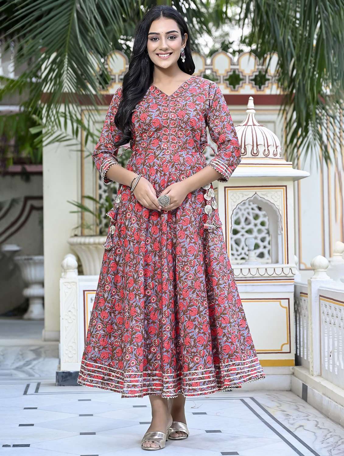 - » women grey florals printed flared dress