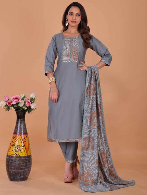 - Find gorgeous sets of ethnic wears in trending designs in grey colors suitable for festive wear of occasions.