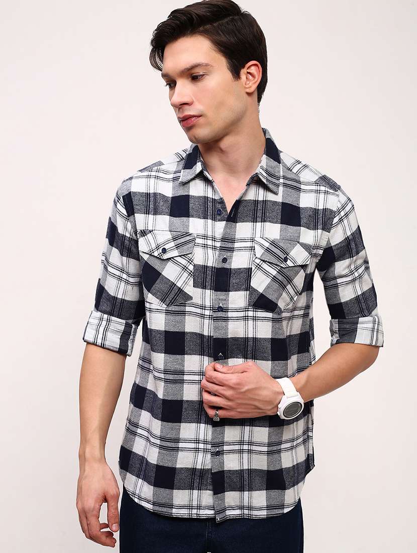 men checkered long sleeves double pockets casual shirt