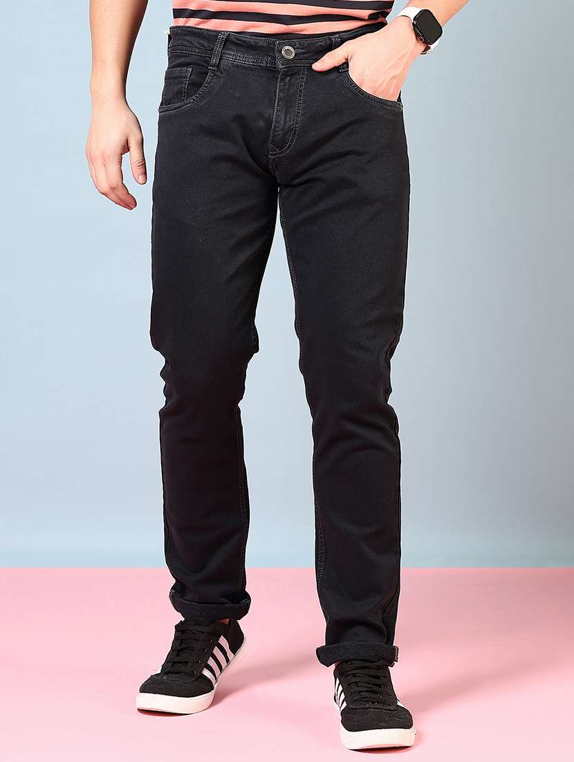 - » men plain mid rise full length denim jeans