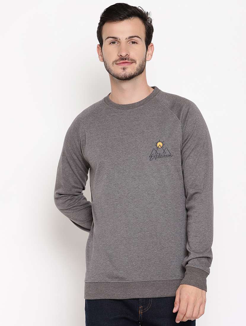 Grey solid explorer sweatshirt, has a round neck, long sleeves, straight hem and chest embroidery.