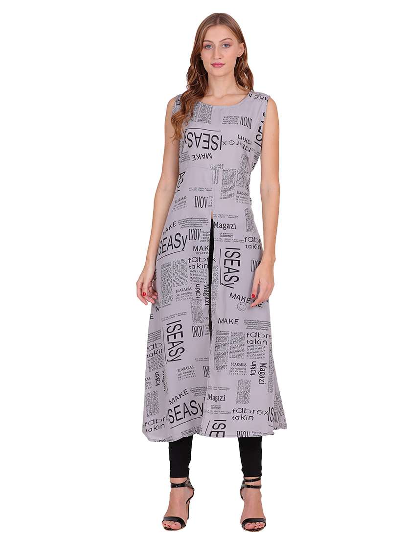 - » women typographic sleeveless front slit kurta