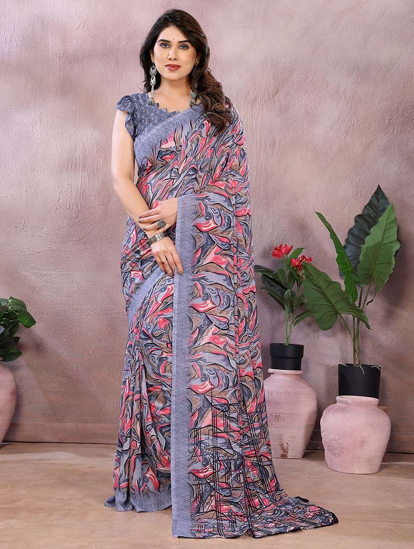 Add effortless elegance to your wardrobe with this flattering printed georgette saree, designed for the modern woman who values comfort and style. Crafted from lightweight georgette fabric, this saree features a soft, flowing drape that complements your silhouette beautifully. The all-over print adds a touch of charm, making it perfect for both office wear and casual day outings.