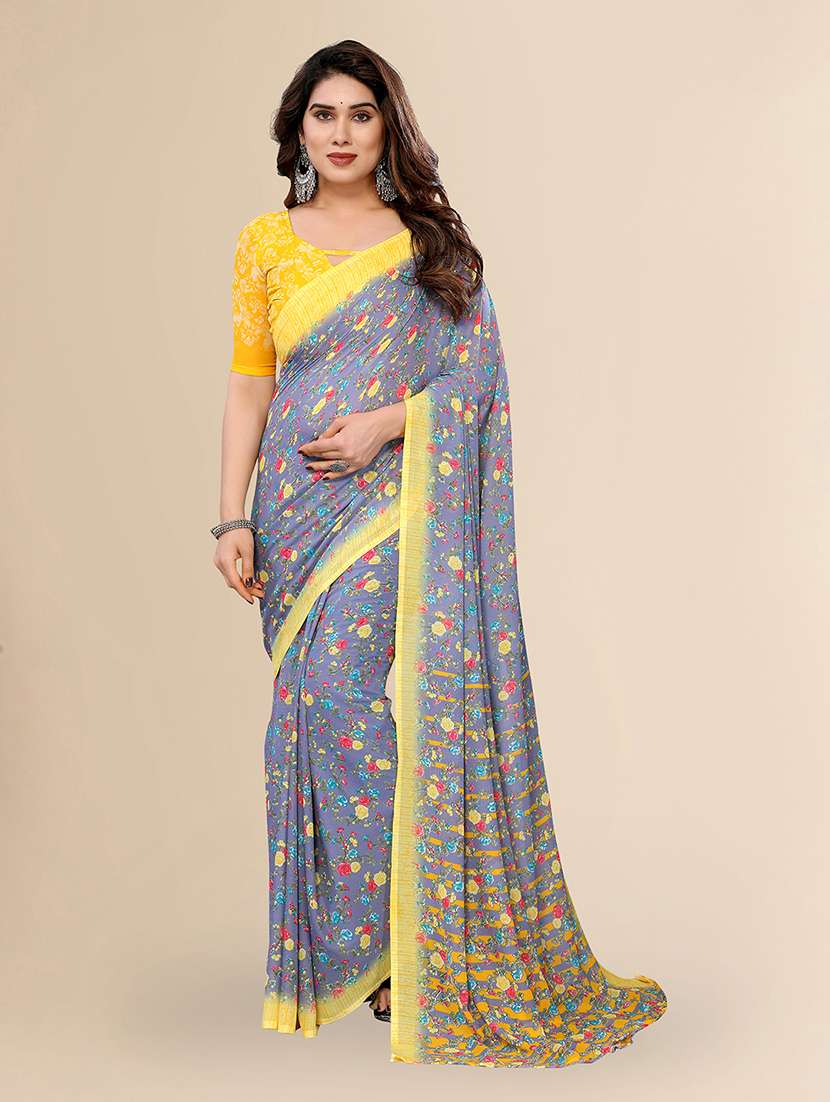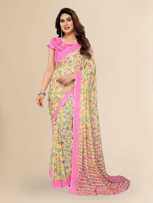 This floral print georgette saree is a perfect blend of grace and ease. Its lightweight drape makes it ideal for warm-weather occasions, while the vibrant floral patterns add a touch of freshness to your look. Style it with a sleeveless blouse, minimal jewelry, and strappy sandals for a chic daytime ensemble, or amp it up with bold earrings and a clutch for an elegant evening vibe.