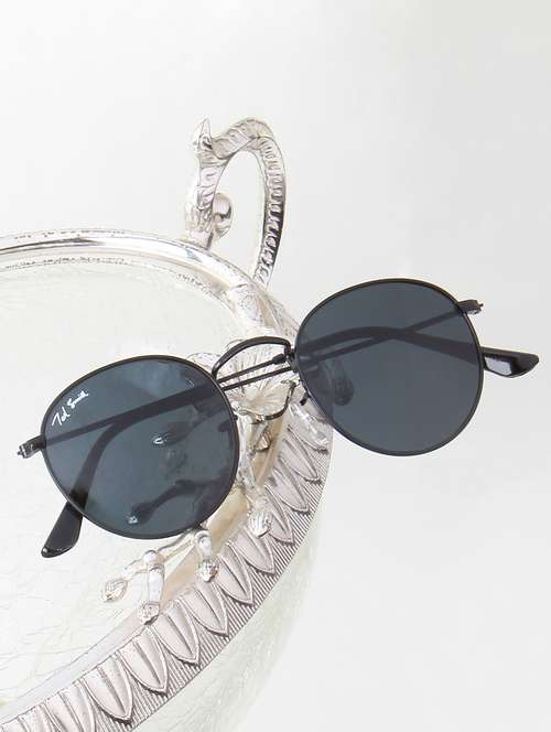 Ted Smith Unisex Round Sunglasses feature a sleek matte black metal frame and stylish grey glass lenses. Designed for both men and women, these sunglasses offer 100% UV protection, combining fashion and functionality in a classic round shape for a trendy, timeless look.