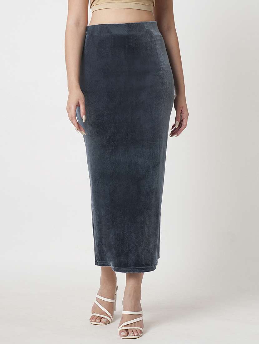 - » women's grey high rise stretchable velvet solid back slit midi party pencil skirt
