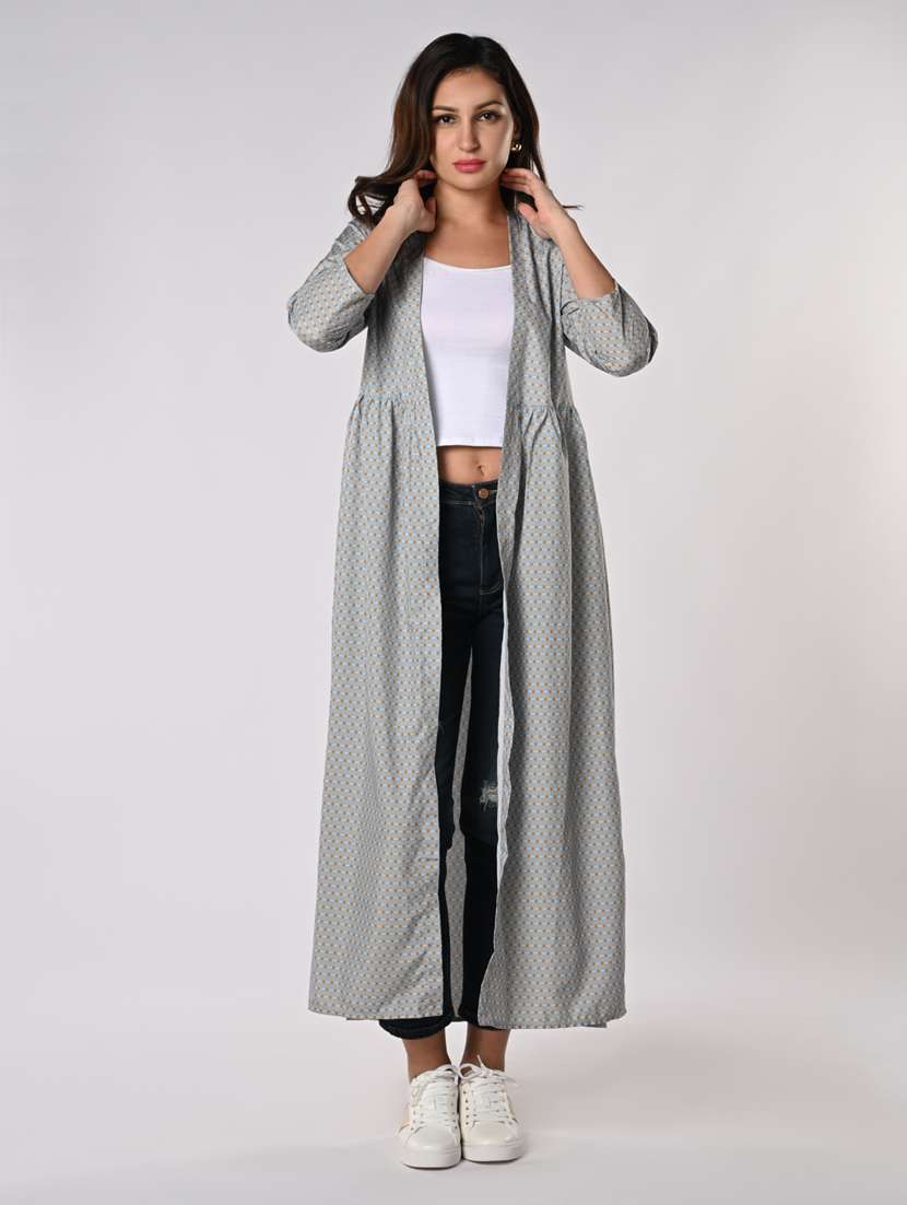 - » women printed three quarter sleeves long regular shrug